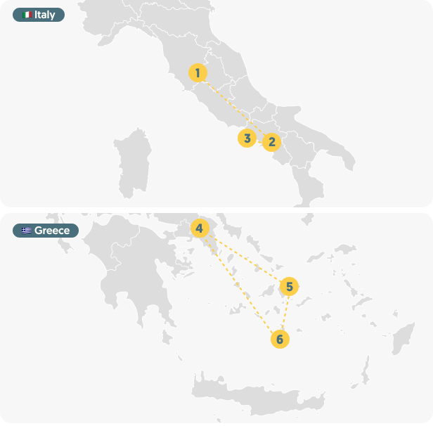 The Mediterranean Sea is one of the world’s most historically rich and spectacularly scenic bodies of water. On this 14-day tour, you will experience the absolute best that the Mediterranean coasts of Italy and Greece have to offer. You will discover Rome’s incredibly imperial history and the iconically beautiful Amalfi Coast in Italy. In Greece, you will walk among legends in Athens, venture off the beaten path in Naxos, and sail your way around Santorini. Not only will you enjoy some of Europe’s best beaches, but you will also learn more of the amazing history and traditions behind Italy’s and Greece’s finest cultural treasures.