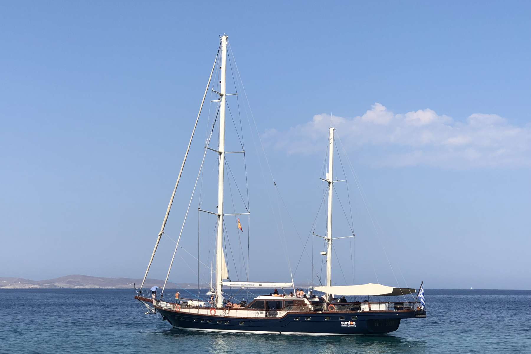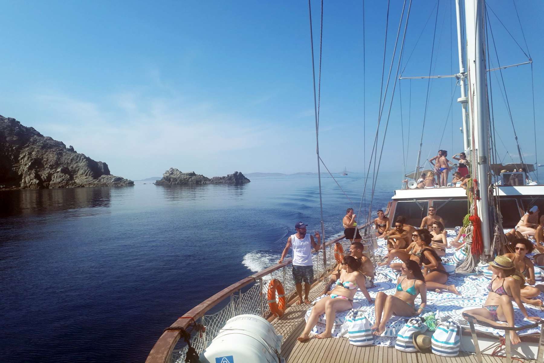 Start your day early: hop on your arranged shuttle transportation, and reach the port! A short tender ride will follow from the small dock in order to embark the sailing yacht anchored out in Agios Ioannis bay and waiting for you, where the crew will be waiting for you on the dock to introduce you to the safety measures of your trip and give you an outline of the cruise itinerary.